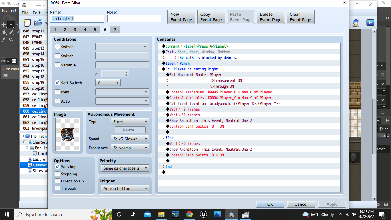 Your event has a lot of pages, maybe there is something wrong there. So just to make sure, can you try to make the setup work on an event with only one page?